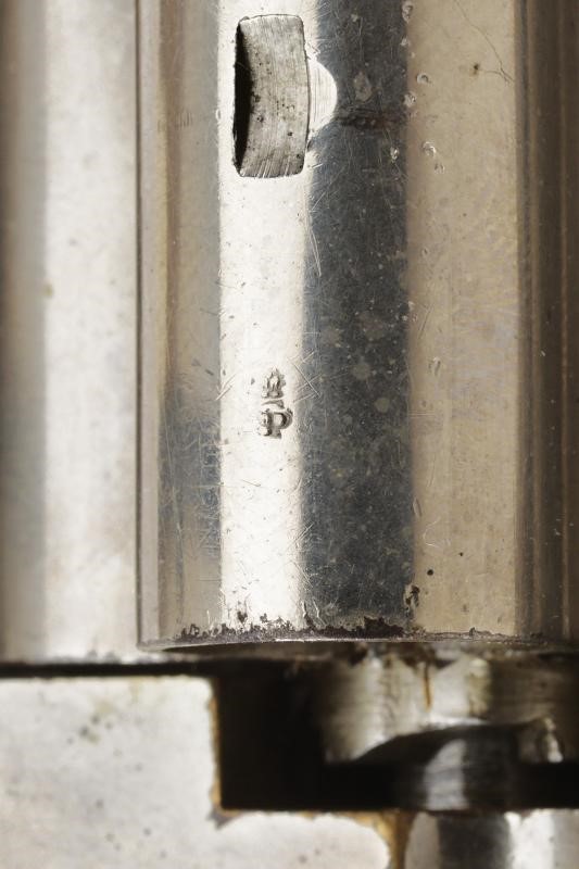 Canna da 3" con marcatura standard in due righe fra crocette. Anima da pulire, rigatura visibile. Punzoni del Banco di Prova di Londra. Matricola "3xx" sul lato inferiore. Cal. 41 rimfire. Tipico tamburo a quattro colpi, anche questo con punzoni del banco di Londra e matricola coeva alla canna. Castello con matricola coeva e timbro "B" all'interno. Guancette antiche in legno (mogano?) con iscrizione all'interno della matricola (uguale al revolver). Bella finitura nichelata, molto probabilmente antica, presente al 90% circa. Cane e grilletto con resti di brunitura color blu.