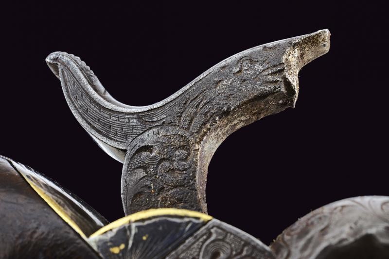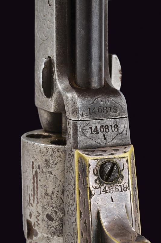 Canna ottagonale rigata, da 6", con mirino in ottone, cal. 31. Rigatura visibile, qualche incrostazione e intaccatura all'interno. Rara marcatura dorsale "Sam.l Colt" incisa a mano. Sui fianchi belle incisioni a racemi su fondo a granuli, su quello destro anche una testa di segugio, su quello sinistro un mostro. Tamburo a sei colpi con evidenti segni d'uso e del tempo. Tracce della scena d'assalto alla diligenza ancora visibile, leggibili la matricola e la marcatura del brevetto. Castello inciso a racemi en suite con al canna, sul lato sinistro "COLT'S PATENT". Il cane con resti di incisioni, visibile su un fianco la testa di lupo. Meccanica funzionante, tre scatti. Bande dell'impugnatura in ottone che conservato il 60% circa della vecchia argentatura, parzialmente incise. Guancette in noce. Matricola "146xxx" coeva su canna, tamburo, castello, perno centrale (abbreviato) e bande impugnatura. Il fermo senza numerazione. I componenti principali timbrati "I" accanto alle matricole.