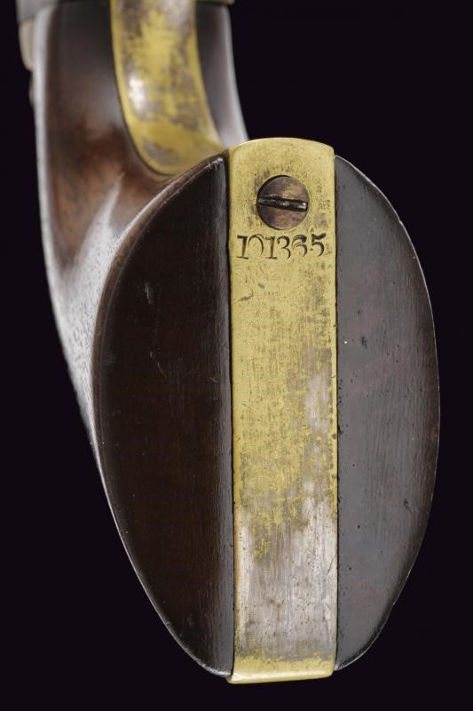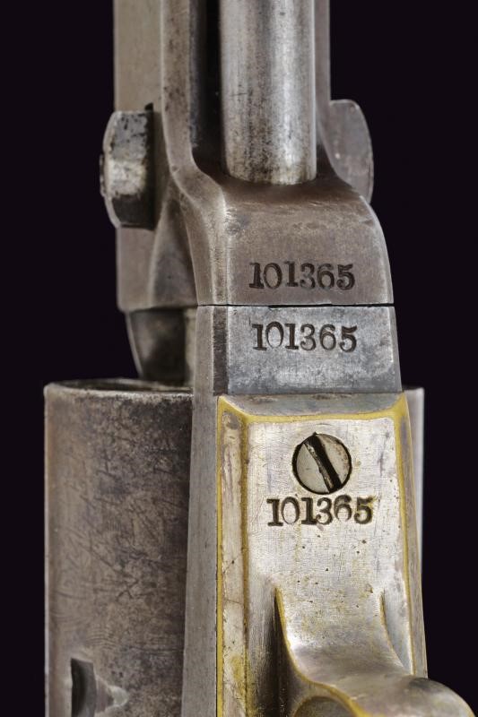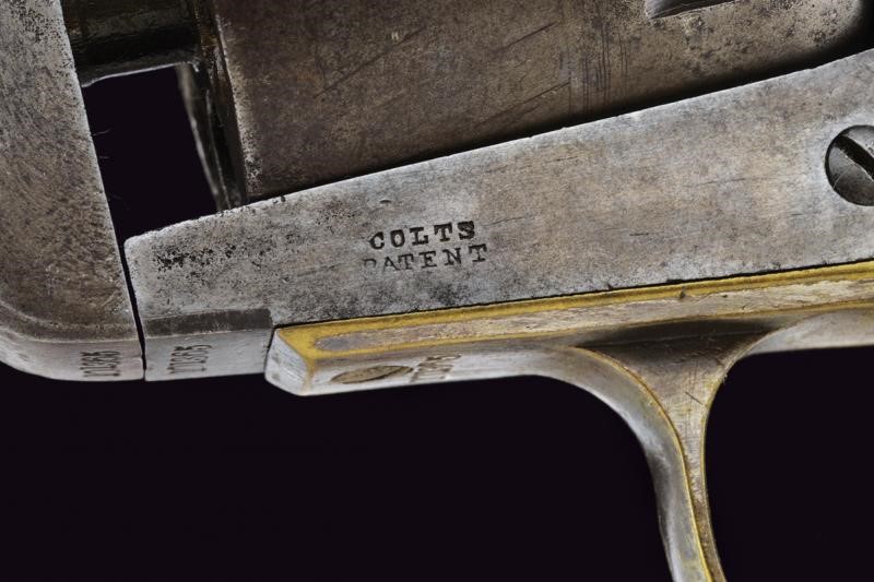 Quarto modello. Canna ottagonale da 7-1/2", rigata (rigatura visibile, lievi incrostazioni all'interno), dotata di mirino, recante marcatura dorsale dorsale standard ben leggibile, terminante in "AMERICA". Canna con matricola coeva al castello, calcatoio e fermo sempre con matricola coeva ma abbreviata; cal. 36. Tamburo a sei colpi con resti di scena della battaglia navale tra Texas e Messico, ancora leggibile il brevetto e i numeri di serie (sempre coevi al castello). Meccanica funzionante, tre scatti, sicura al grilletto funzionante. Castello con marcatura "COLTS PATENT" e Matricola "101xxx", il perno del tamburo con matricola coeva abbreviata. Bande dell'impugnatura in ottone con resti di argentatura, sempre con matricole coeve. Il ponticello del tipo tondeggiante grande. Qualche intaccatura. Impugnatura liscia in noce.