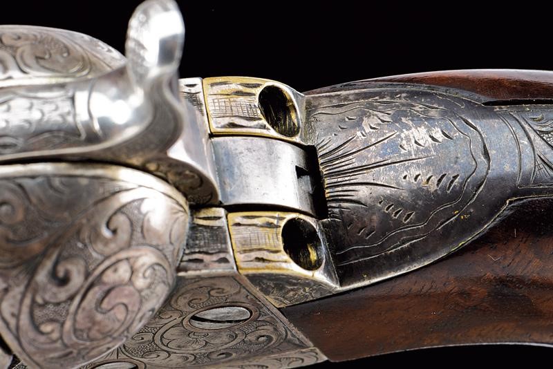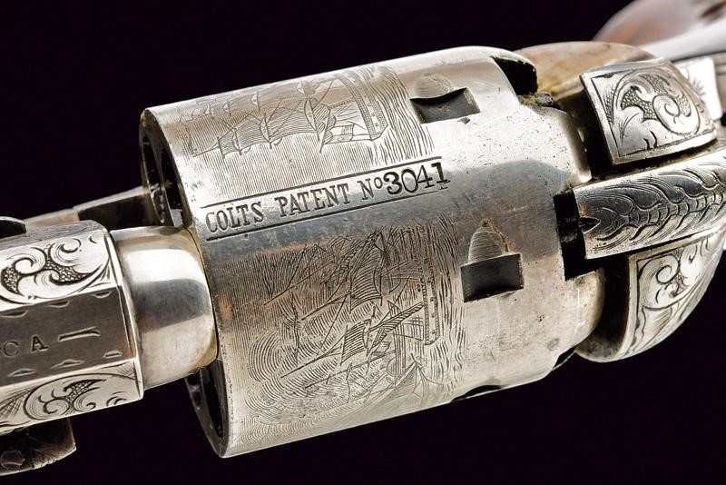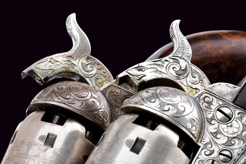 Entrambi i revolver con canna da 7,5" dotata di mirino a cuspide in ottone, marcatura "- ADDRESS COL. SAM.L COLT NEW-YORK US AMERICA -", cal. 36. Anime pulite, rigature visibili, varie intaccature all'interno. Tamburi a sei colpi con scena della battaglia navale di Campeche ben marcata e visibile, leggibile anche la didascalia con la data. Qualche intaccatura nell'area dei luminelli, sul retro del tamburo. Entrambi i revolver con meccanica funzionante, tre scatti e sicura al grilletto funzionante. Castelli con dicitura "COLTS PATENT" timbrata. Bande dell'impugnatura in ottone. Impugnature in radica di noce, ornate con stella in argento su un lato e emblema effigiante una moneta azteca sull'altro. Un cane reca resti di tre cerchietti marcati al dorso (scarsamente visibili). I revolver presentano matricole non consecutive ma molto ravvicinate (entrambi 1330xx) e ed entrambi sono monomatricola. Le matricole sono presenti (intere o abbreviate) su tutti i componenti principali inclusi i fermi, i calcatoi e i perni. In entrambe le Colt il codice "E" marcato sopra o sotto ai numeri di serie su castello, canna e bande impugnatura. I revolver presentano pattern di incisioni molto simili, nel tipico stile di Gustave Young con girali di racemi su fondo a granuli, presenti alla culatta, sui fianchi del castello e, a segmenti, sulle bande dell'impugnatura. Si alternano ad aree sapientemente non decorate, per non appesantire troppo l'aspetto e lo slancio delle pistole, e ad altri piccoli elementi decorativi, quali cornicette alle volate e attorno alle marcature, conchiglie al dorso delle impugnature e teste di lupo sui fianchi dei cani. Leggere differenze nei motivi decorativi fra i due revolver. Uno dei due ponticelli marcato "2". Tutti e due i revolver conservano gran parte (circa il 95%) dell'argentatura, di realizzazione non recente (rinfrescata?). Le lievi mancanze alla finitura si concentrano soprattutto sulle bande delle impugnature. In una cassetta di legno, probabilmente adattata ma non in epoca recente, contenente alcuni accessori: una fiasca da polvere marcata "COLTS PATENT", un fondipalle sul tipo Colt, un attrezzo di smontaggio e alcuni contenitori.
