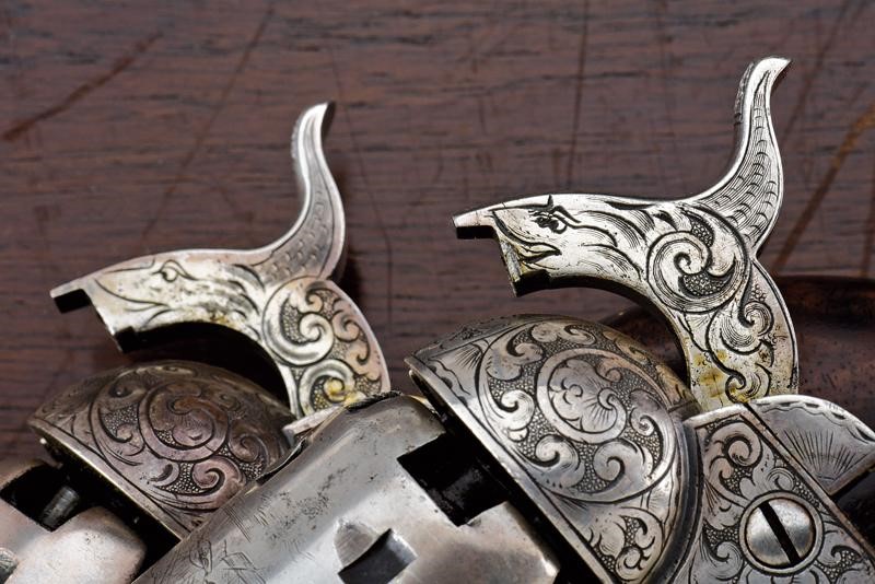 Importante paio di Colt Model 1851 Navy con incisioni di fabbrica stile Gustave Young, in cassetta, 1863