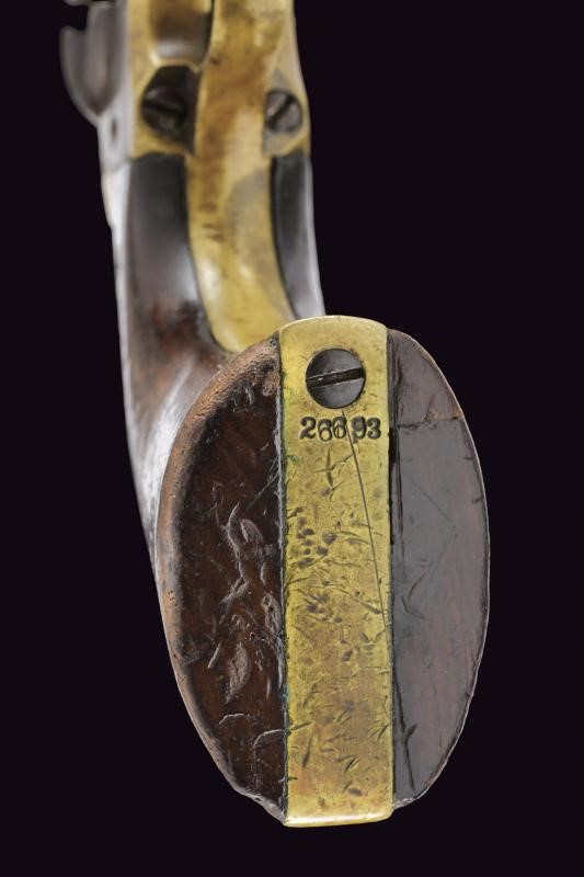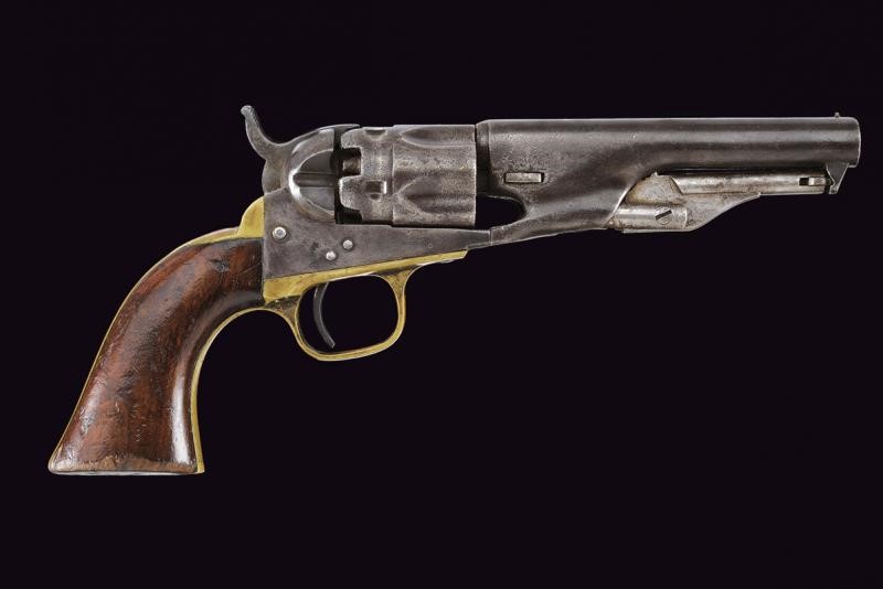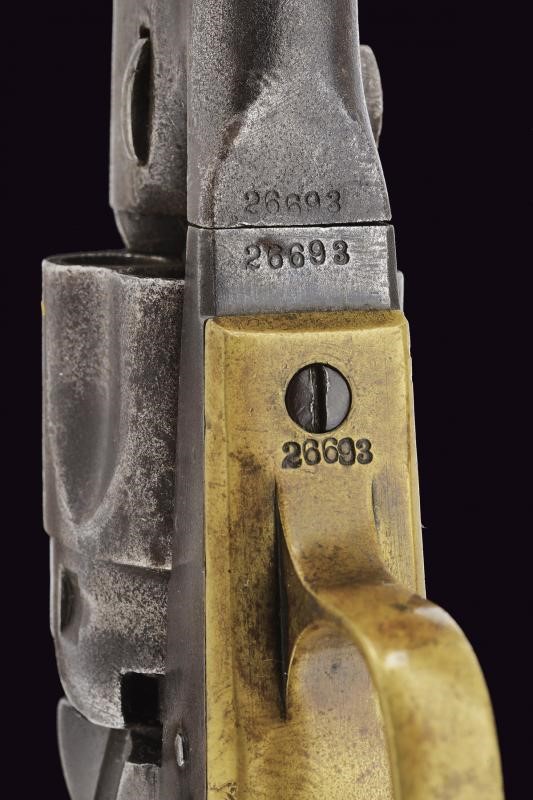 Canna tonda da 4-1/2" rigata (anima da pulire, incrostazioni, rigatura visibile) con marcatura dorsale standard, mirino conico in ottone, cal. 36. Tamburo del tipo sgusciato e ribassato, a cinque colpi, recante marcatura del brevetto. Meccanica funzionante ma da rivedere, tre scatti e sicura funzionante. Castello marcato "COLTS PATENT". Bande dell'impugnatura in ottone. Matricola "266xx" coeva su canna, castello e bande impugnatura. Ponticello con dicitura "36 Cal." Intaccature in vari punti. Impugnatura liscia in noce.