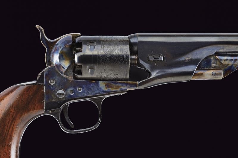 Perfettamente riprodotta, con canna cilindrica, tamburo a sei colpi con scena di battaglia navale di Campeche e brevetti Colt. Castello con marcatura "COLT's PATENT". Impugnatura in noce. Modello con scassi ed agganci per il calcio rimovibile (non presente). Bella brunitura color blu ben conservata, con minimi segni del tempo, castello e calcatoio tartarugati. Meccanica funzionante. Conservata in una cassetta in legno, probabilmente non pertinente, foderata all'interno in velluto rosso.
