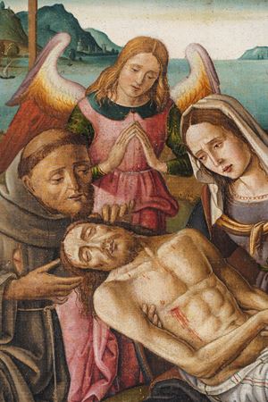 Il confronto più stringente per la nostra tela è naturalmente quella di identico soggetto a Baltimora, in cui ricompare il motivo della finta cornice dipinta a motivi vegetali. Le due opere sono accomunate anche dalla stessa intonazione devozionale e penitenziale, secondo il clima culturale diffuso tra la fine del XV e l'inizio del XVI secolo, che affida al quadro sacro il compito di fare leva sulle emozioni per coinvolgere il riguardante in una dolorosa immedesimazione. A questo corrisponde l'atteggiamento sofferente e contrito di tutti i personaggi, non solo i protagonisti "storici" ma anche e soprattutto San Francesco, raffigurato in primo piano e con le stesse piaghe del Cristo ben in evidenza, e San Girolamo sullo sfondo che si batte il petto adorando la Croce. La presenza e la rilevanza data all'interno della composizione alla figura di San Francesco fa ipotizzare una committenza conventuale francescana.