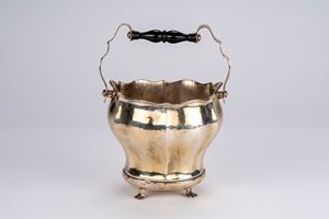 a corpo sbalzato e costolato, manico sagomato con presa in legno tornito, piedini a zampa ferina.