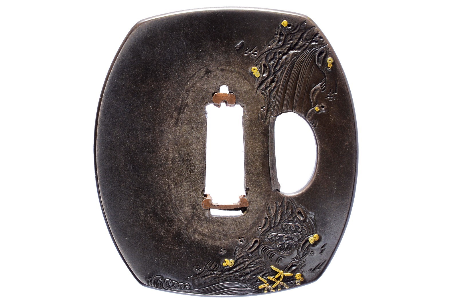In shibuichi, kawari-kaku-gata; katakiri-bori, hira-zogan in oro, con effige del guerriero Shoki che ccavalca un mostro; kozuka-hitsu-ana, sekigane in rame, kaku-mimi-koniku. Prima metà del XIX secolo.
