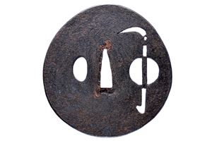 In ferro di rara forma ovoidale; migaki-ji, ko-sukashi raffigurante una falce contro il sole; piccolo kozuka hitsu-ana, sekigane in rame, kaku-mimi-koniku. In kiri-box. Rara.
