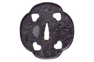 In ferro di forma mokko; la superficie con tsuchime e inome-bori-sukashi; kozuka hitsu-ana con ategane punzonato; sekigane in rame, mei, taka-mimi. 1450 - 1500 circa. In kiri-box. (Mimi 0.4 cm.)