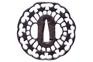 In ferro, maru-gata con mimi lavorato a petali (hana-gata), sukashi con raggi e cuori (inome) stilizzati, kozuka e kogai hitsu-ana. Fine periodo Momoyama.