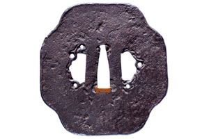 In ferro, mokko-gata; con superficie amida yasuri. Piccoli trafori al bordo di kozuka e kogai histu-ana; sekigane in rame, taka-mimi. Fine del periodo Edo. In kiri-box.