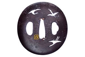 In ferro, tate-maru-gata; con superficie migaki-ji, ko-sukashi raffigurante oche in volo; kozuka e kogai hitsu-ana, sekigane in rame, mei con sigillo in oro, ko-maru-mimi.Fine periodo Edo. In kiri-box.