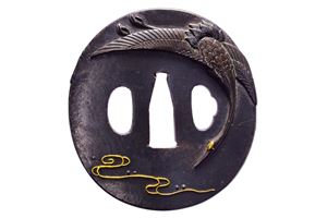In ferro; tate-maru-gata; niku-bori in oro, con raffigurazione di un airone ed di una corda in oro; kozuka e kogai hitsu-ana. 1800 circa.