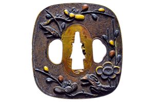 In ottone, nade-kaku-gata; niku-bori in shakudo, rame, oro, con raffigurazione di rami e fiori; kozuka e kogai hitsu-ana, taka-mimi. 1750 circa.