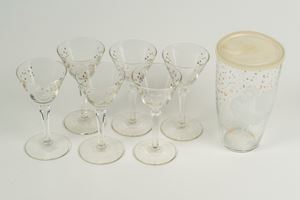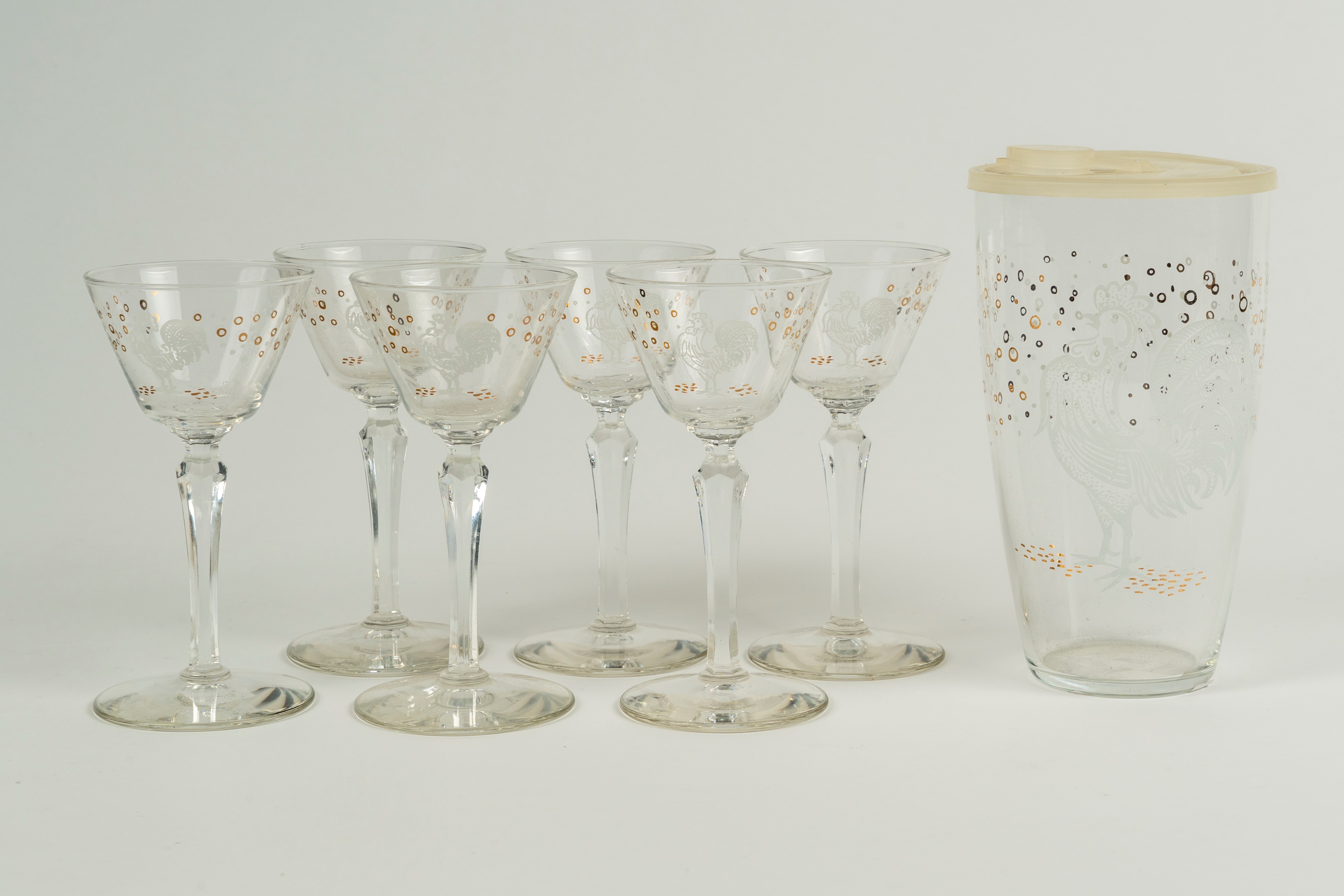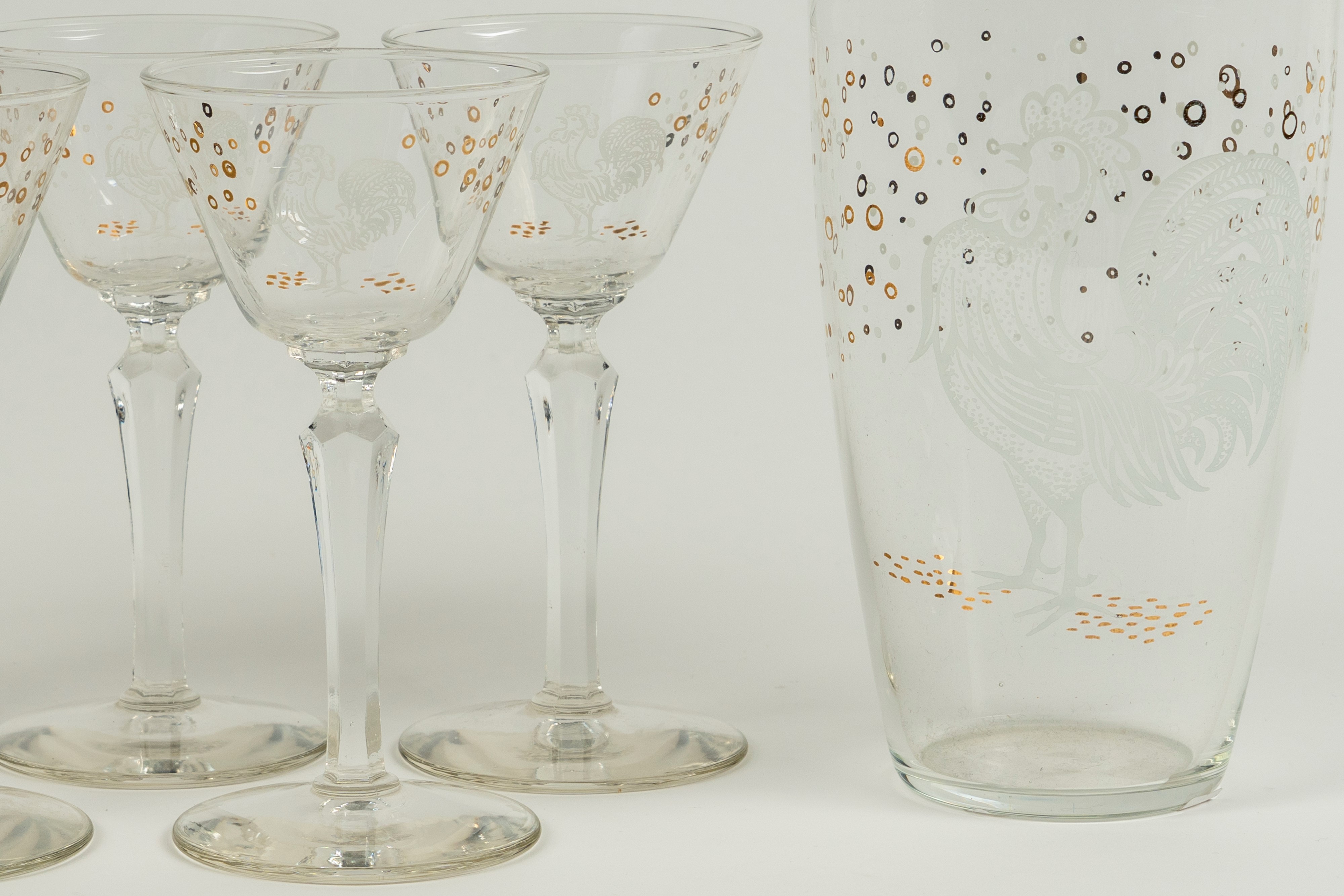 Set da rosolio composto da sei bicchieri, una brocca e un contenitore con tappo in vetro trasparente con decoro al galletto, i bicchieri con stelo sfaccettato su piede circolare