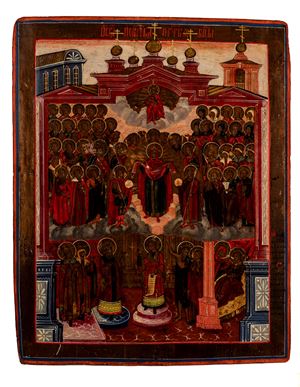 Icona su tavola della Protezione della Santissima Madre di Dio (Pokorov). Russia,