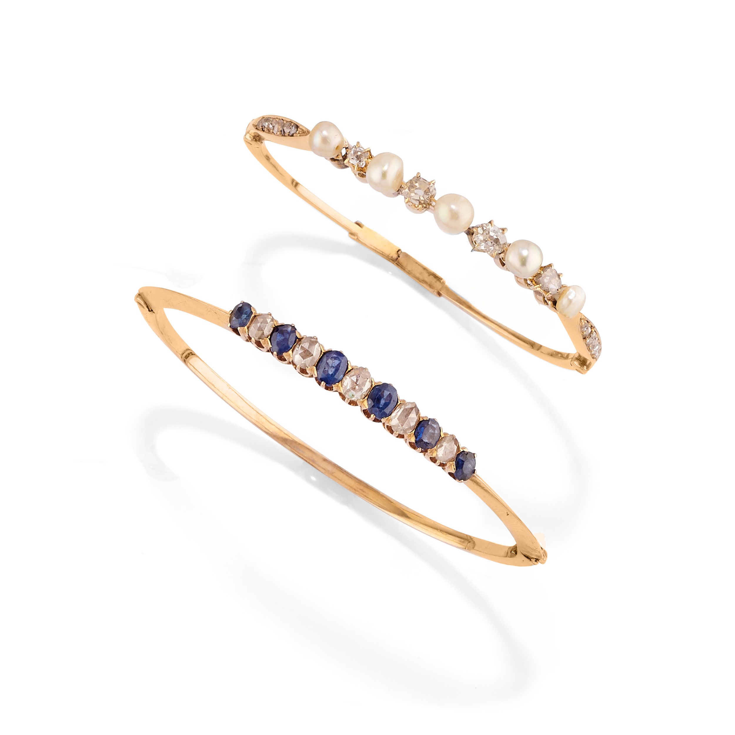 in oro giallo 18kcomposto da un bracciale rigido con perle (prob. naturali), diamanti taglio vecchio e rosa, un bracciale rigido con zaffiri taglio ovale e rotondo, diamanti taglio rosa e una spilla a barretta con microperle, difetti.