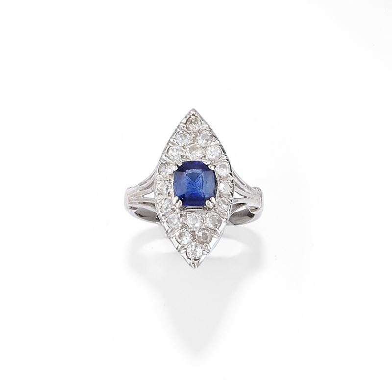 in oro bianco 18kal centro zaffiro sintetico taglio cuscino, contorno in diamanti taglio vecchio per totale ct 0,80 circa.