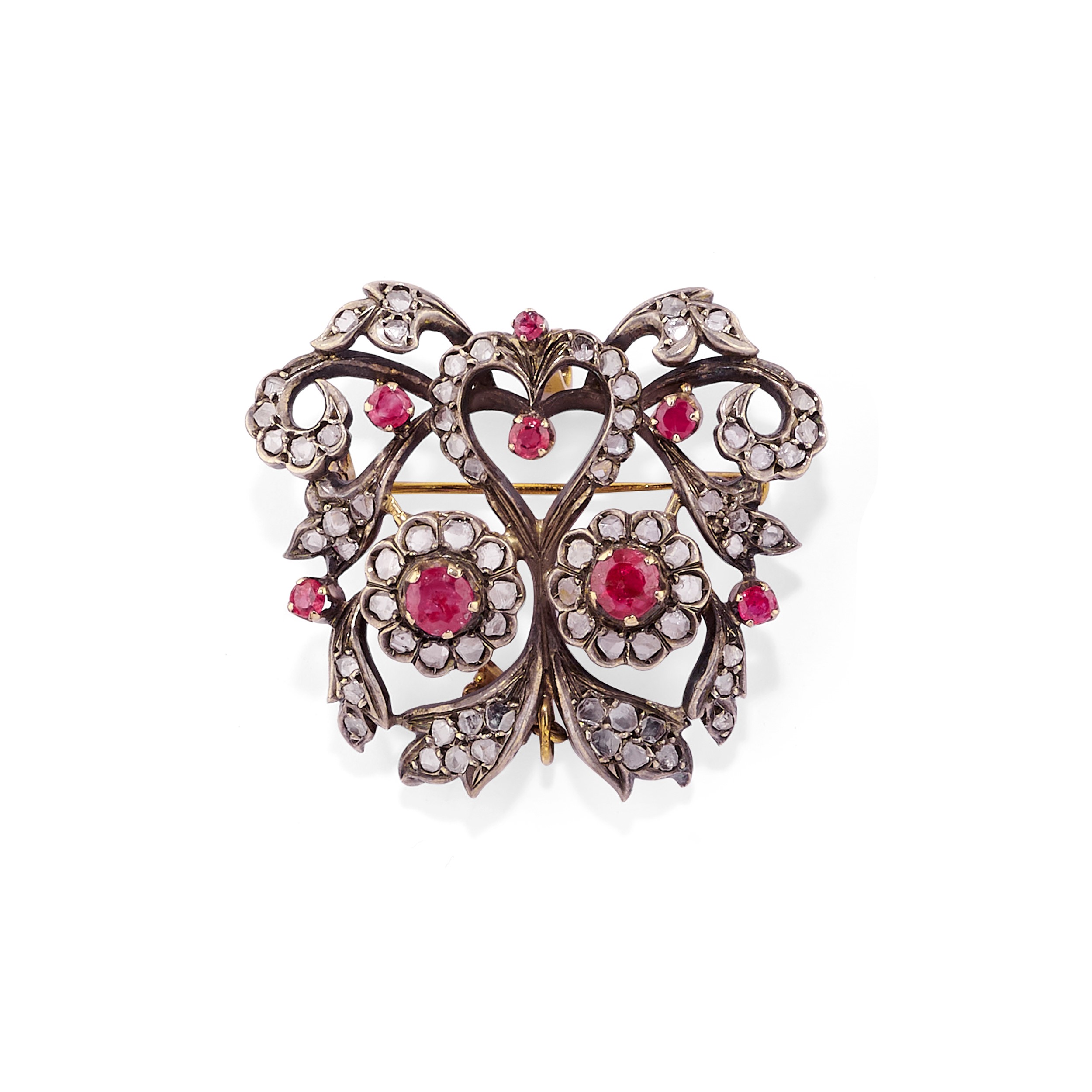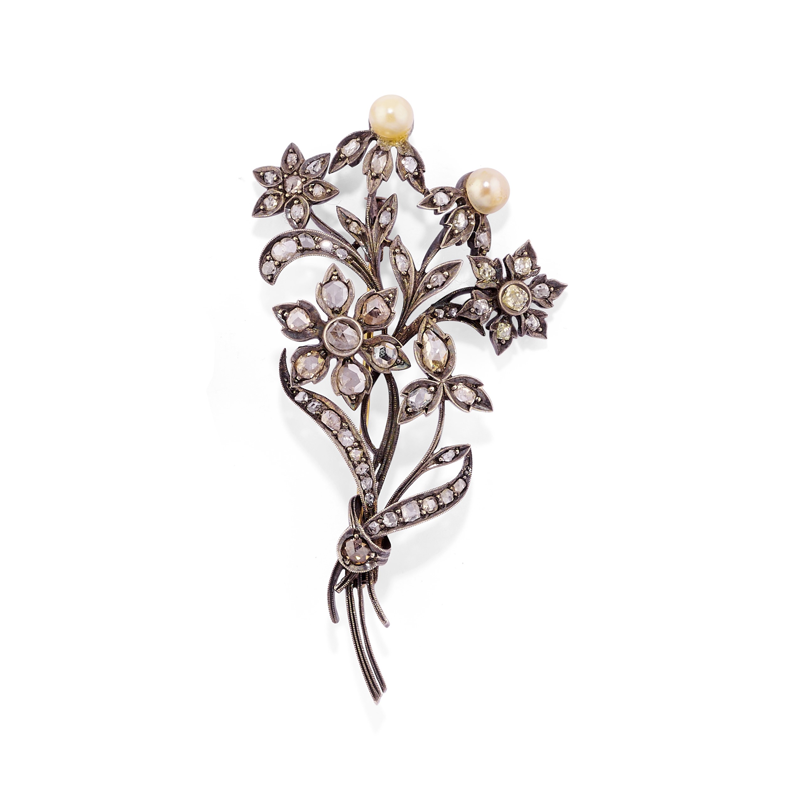 in oro giallo bassa caratura e argentoimpreziosite da perle mabé, diamanti taglio vecchio e rosa e rubini taglio rotondo, difetti.