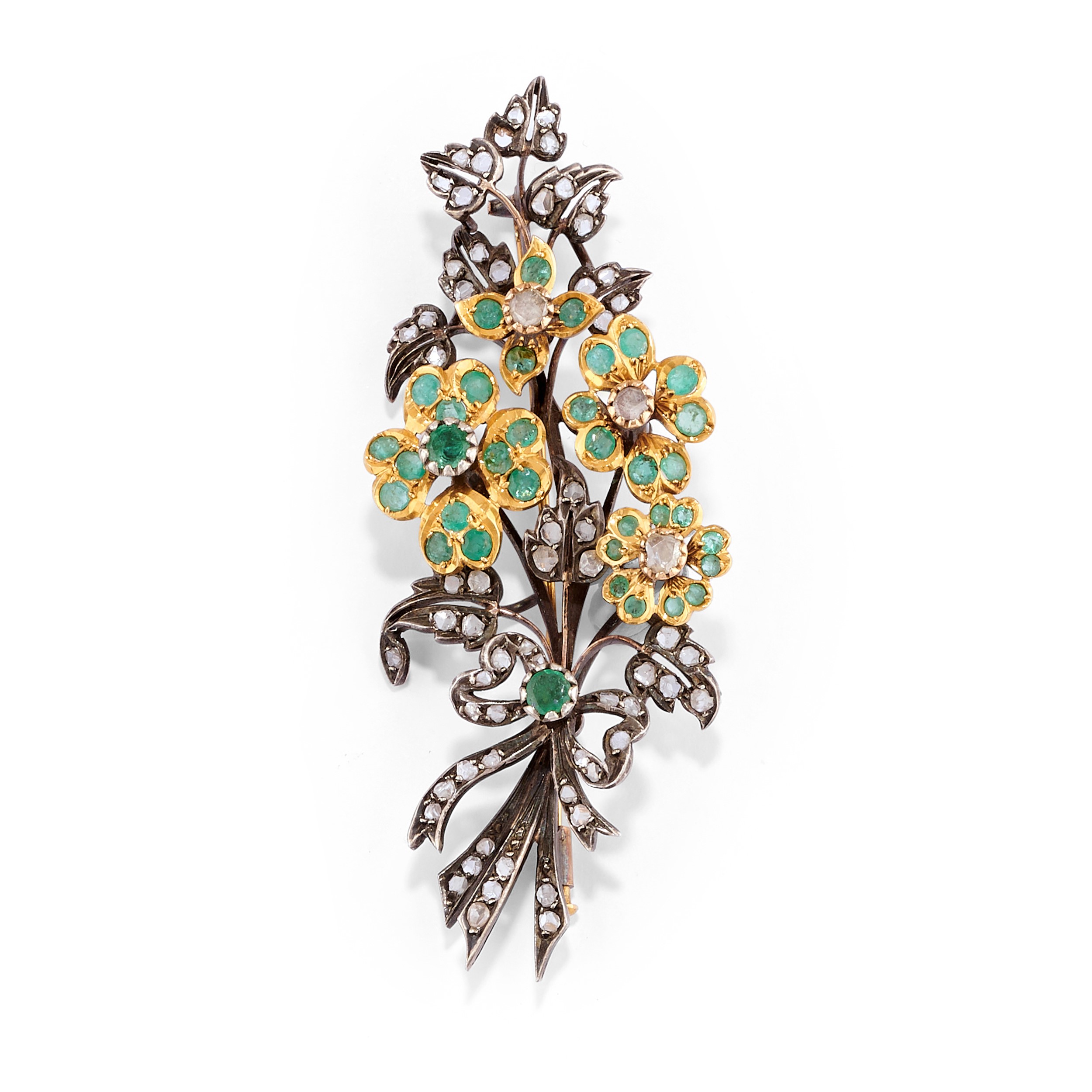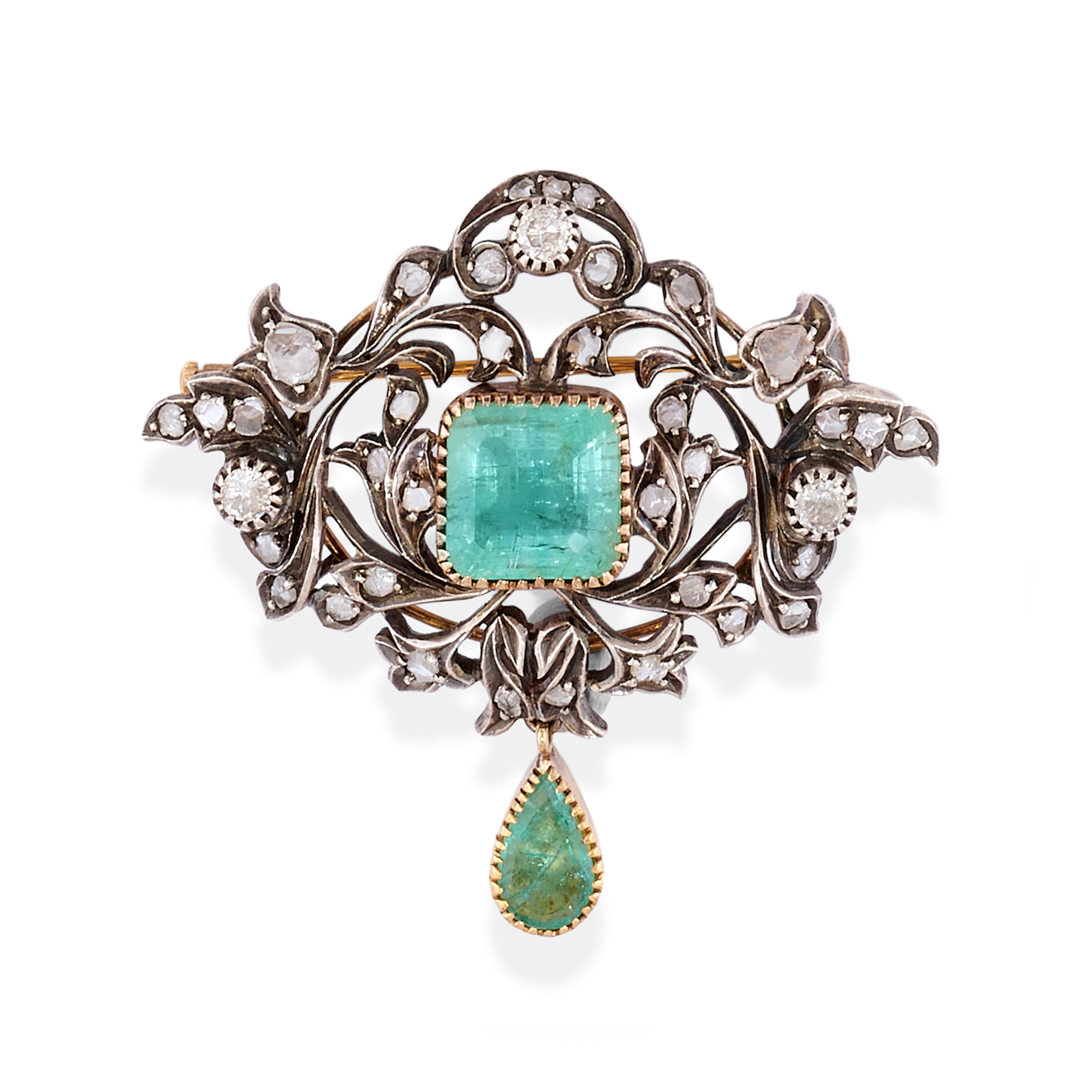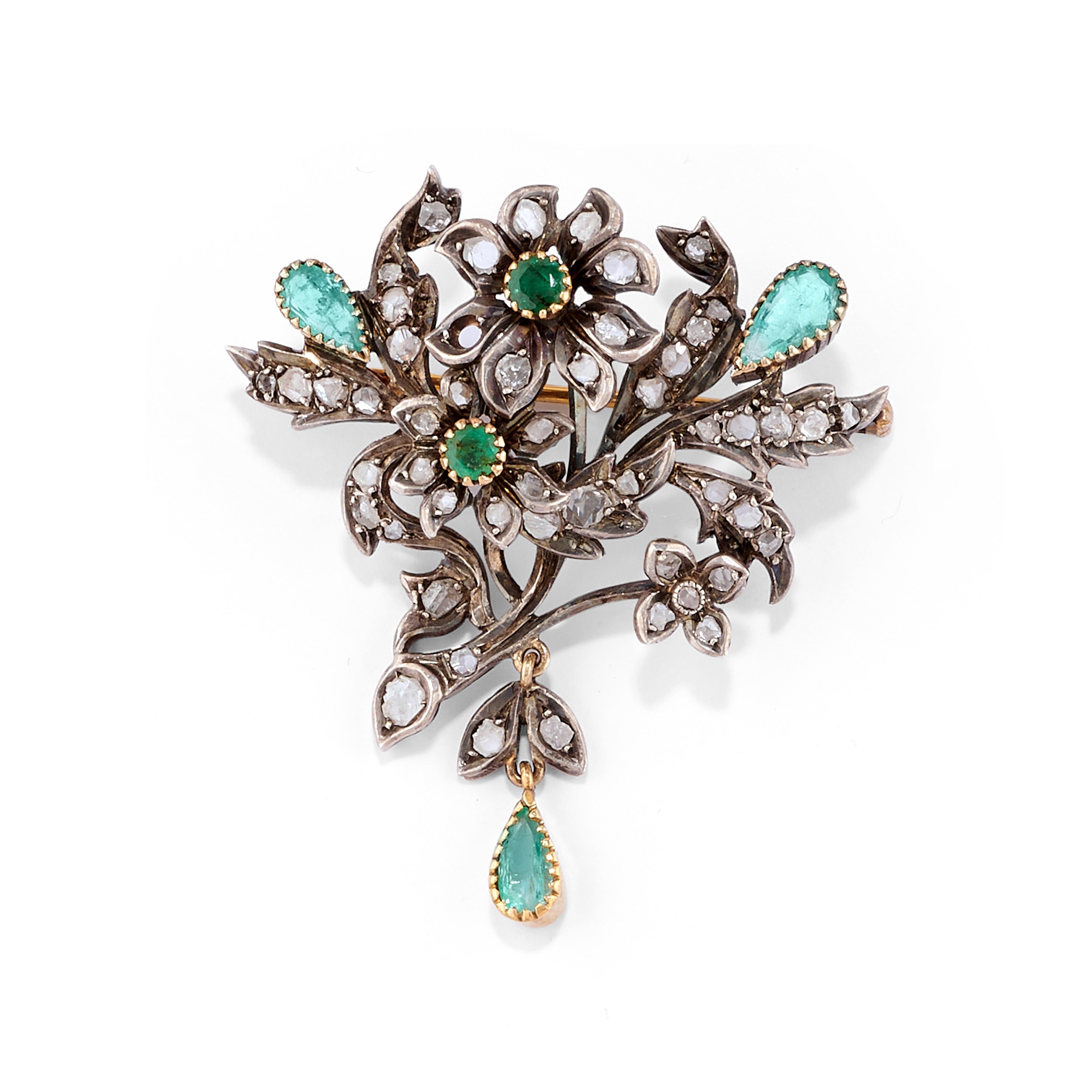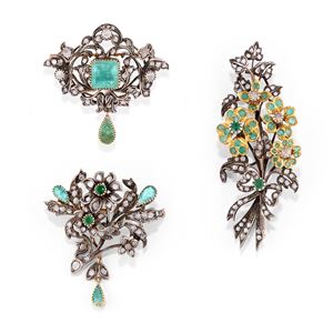 in oro giallo bassa caratura e argentoa motivi floreali impreziositi da smeraldi taglio rotondo, goccia e ottagonale a gradini, diamanti taglio rosa e brillante.