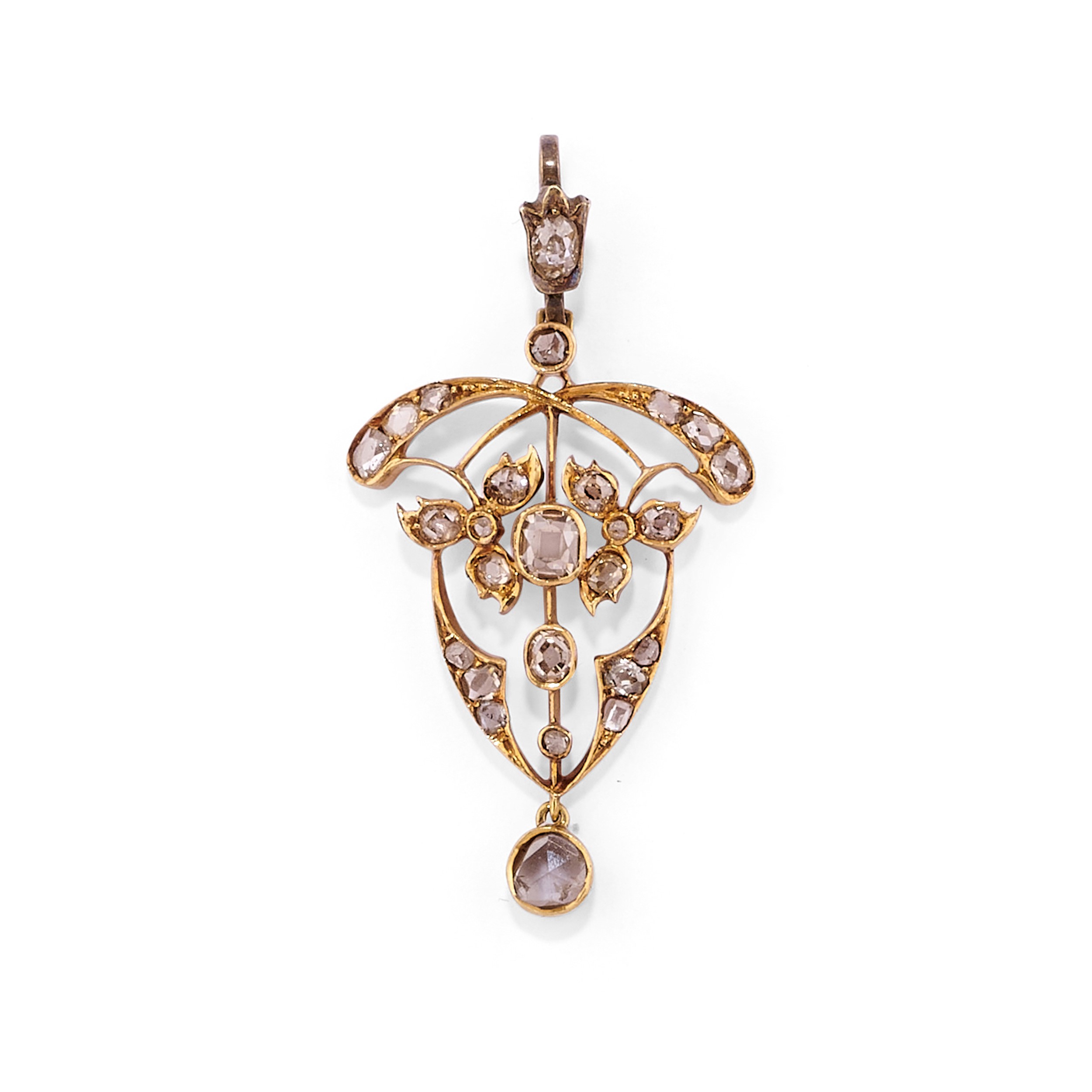 in oro giallo 18k e platinouno a croce con diamanti taglio vecchio per totale ct 1,50 circa, l'altro a scudo con diamanti taglio vecchio e rosa.