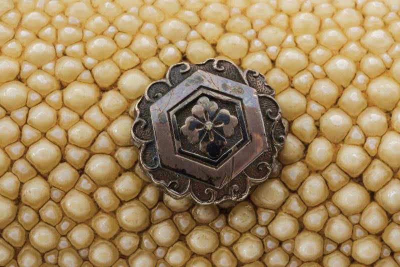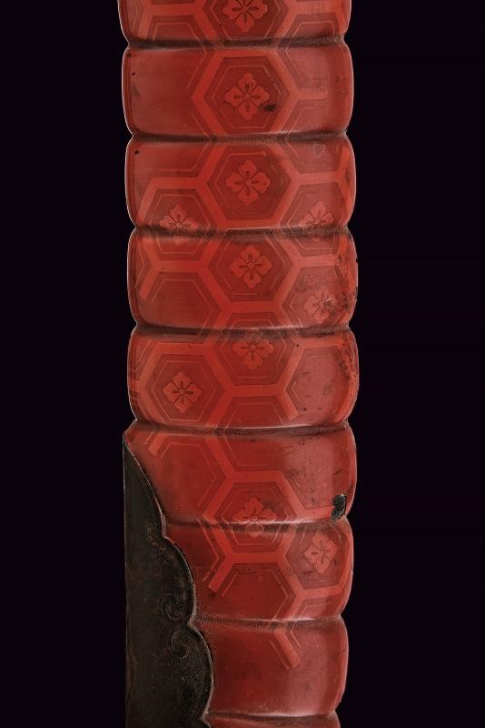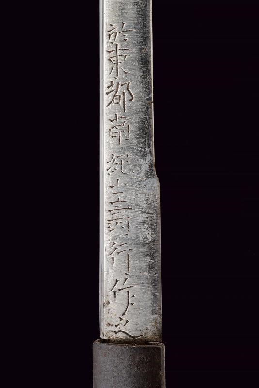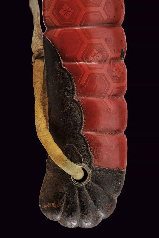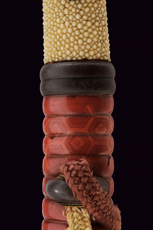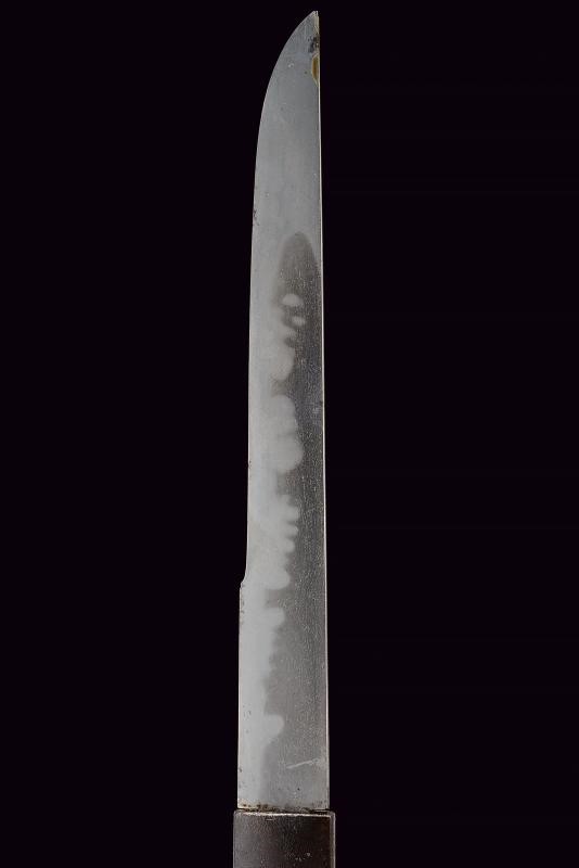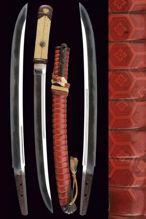 Lama Shobu Zukuri (Nagasa 41 cm). Hamon: Nagare Itame. Hada: Itame Masame; su Ura doppio hi e un piccolo kizu, su Omote un corto bo-hi. Bel habaki in argento inciso. Nakago ben rifinito con Yasuri profonde in Sujikai che rievocano la pioggia, due mekugi-ana. Koshirae con Same, fuchi-kashira in ferro, menuki in argento raffiguranti il Mon di Oda Nobunaga. Bellissima saya in lacca color rosso aragosta (piccole mancanze alla finitura) a spire con Oda Nobunaga mon con fantasia alveare, koiguchi e kojiri in ferro. Ko-gatana di grande dimensione con kozuka in ferro decorato con una mantide e fogliame in oro, rame, argento e shakudo in bassorilievo, con inome; la lama con hamon visibile e lunga mei. Raro.