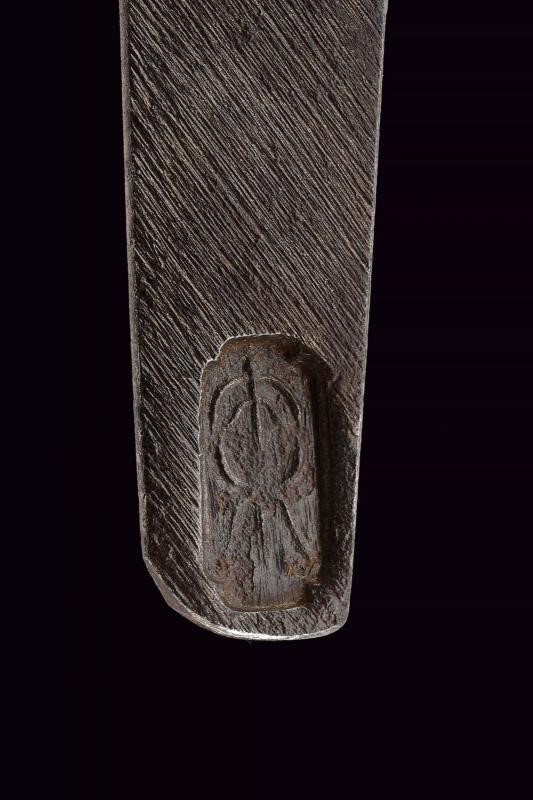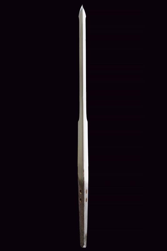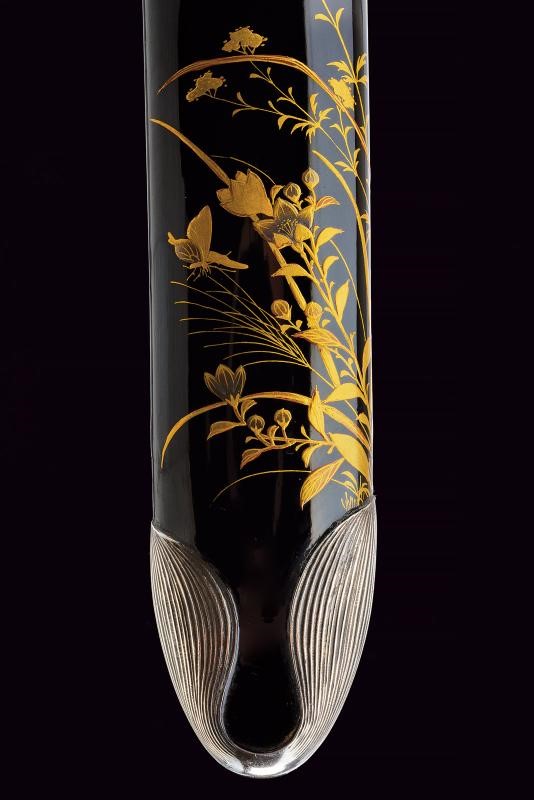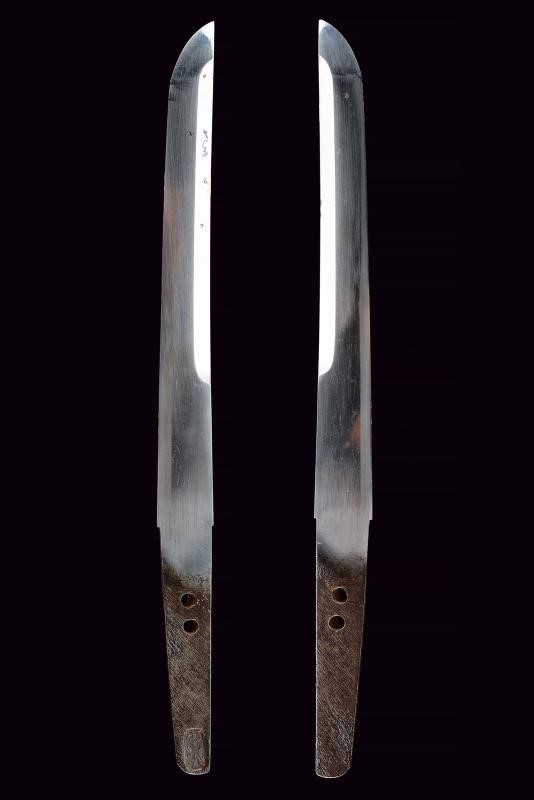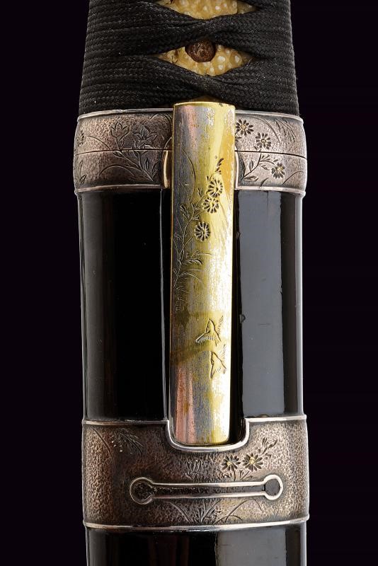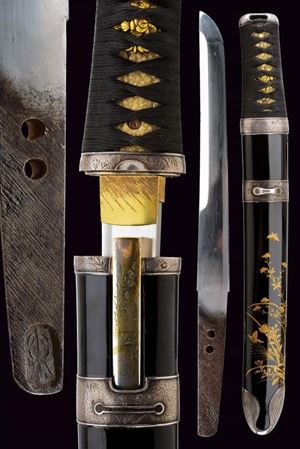 Lama (Nagasa 19 cm) del tipo Yoroidoshi con iokote bosh. Hamon: suguha. Hada: itame nagare. Habaki in rame con lamina in oro. Nakago ubu ha agari kurijiri con due mekugi-ana. Koshirae di eccellente qualità in urushi nero decorato con motivi floreali e farfalle in lacca dorata. Kodogu in argento inciso, kozuka e kogatana completamente in argento. Menuki dorati effigianti peonie.