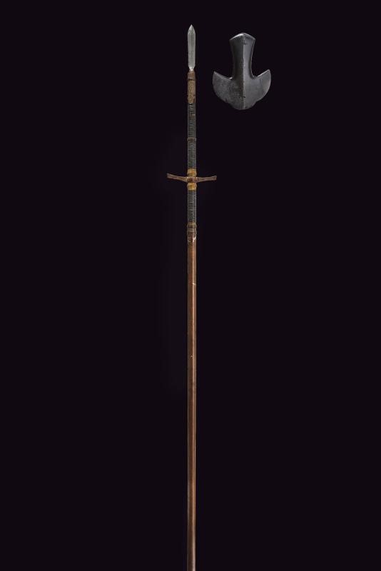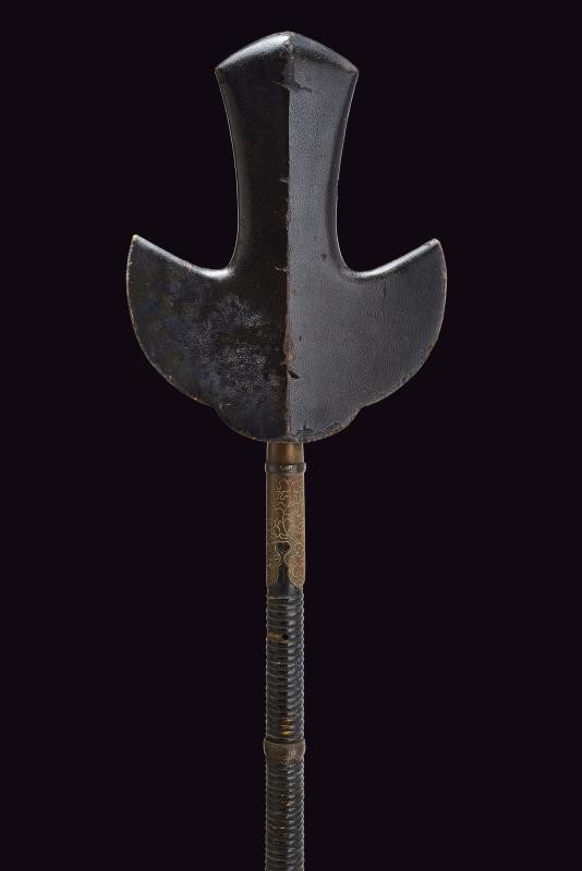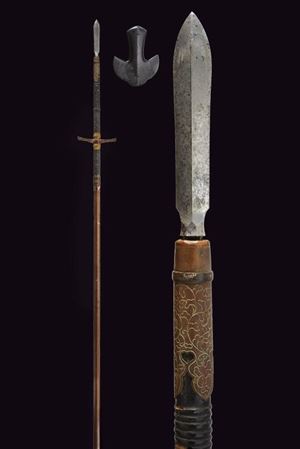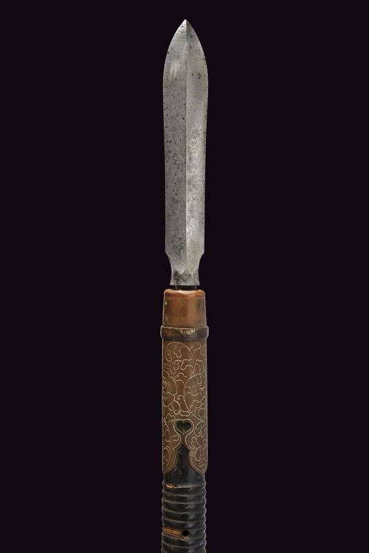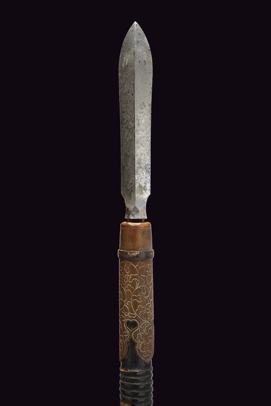 Ho di forma a foglia, entrambe le facce costolate in mezzeria. La parte superiore con fornimenti in rame, incisi a motivi floreali e parzialmente traforati; un'ulteriore fornimento in ferro con parte centrale ad anello, da quale partono due ali a sezione rettangolare. Fusto ligneo, il primo quarto verniciato di nero e scolpito ad anelli sgusciati. Ishizuki in ferro.